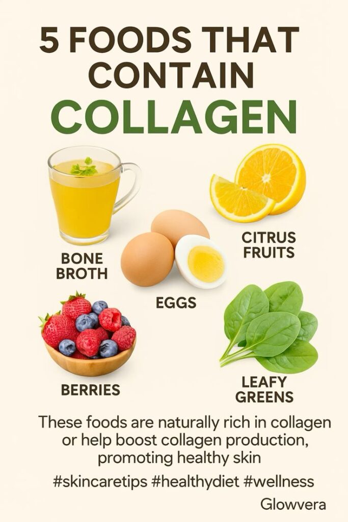 The consumption of bone broth together with chicken skin and fish and eggs will help your body produce more collagen. The collagen production process receives support from Vitamin C which oranges and berries contain as their main nutrient.